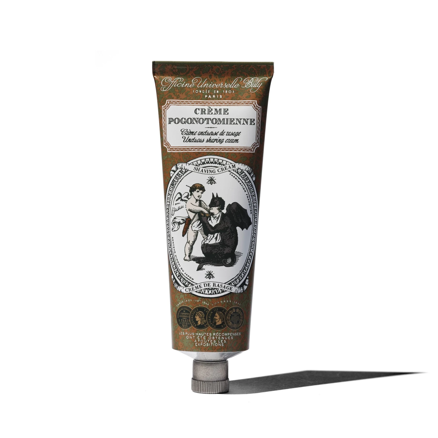Nul besoin d’un fauteuil de barbier ou de gestes aguerris pour se raser de près, et ce, dans les règles. La Crème Pogonotomienne, ou l’art de bien se raser, arrive première dans l’ordre de préséance de cet instant consacré. Une peau bien préparée fait le bon rasage : assurément veloutée, tout bonnement parfumée, cette crème au brassé divin et à la senteur de bois de cyprès japonais, envoûte autant qu’elle produit une admirable douceur là où elle se voit appliquée. L’amande douce qu’elle contient apaise les irritations cutanées et apporte son voile de satin, lorsque la cire d’abeille, nourrissante, laisse un sillage protecteur sur la peau pour prévenir les démangeaisons. Elle est un soin de rasage qui embrasse pleinement les effets de l’après-rasage : la peau devient lisse, douce. Les joues sont enfin prêtes à recevoir le plus charmant des dons : un baiser délicat sur une peau elle-même parée de délicatesse.