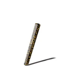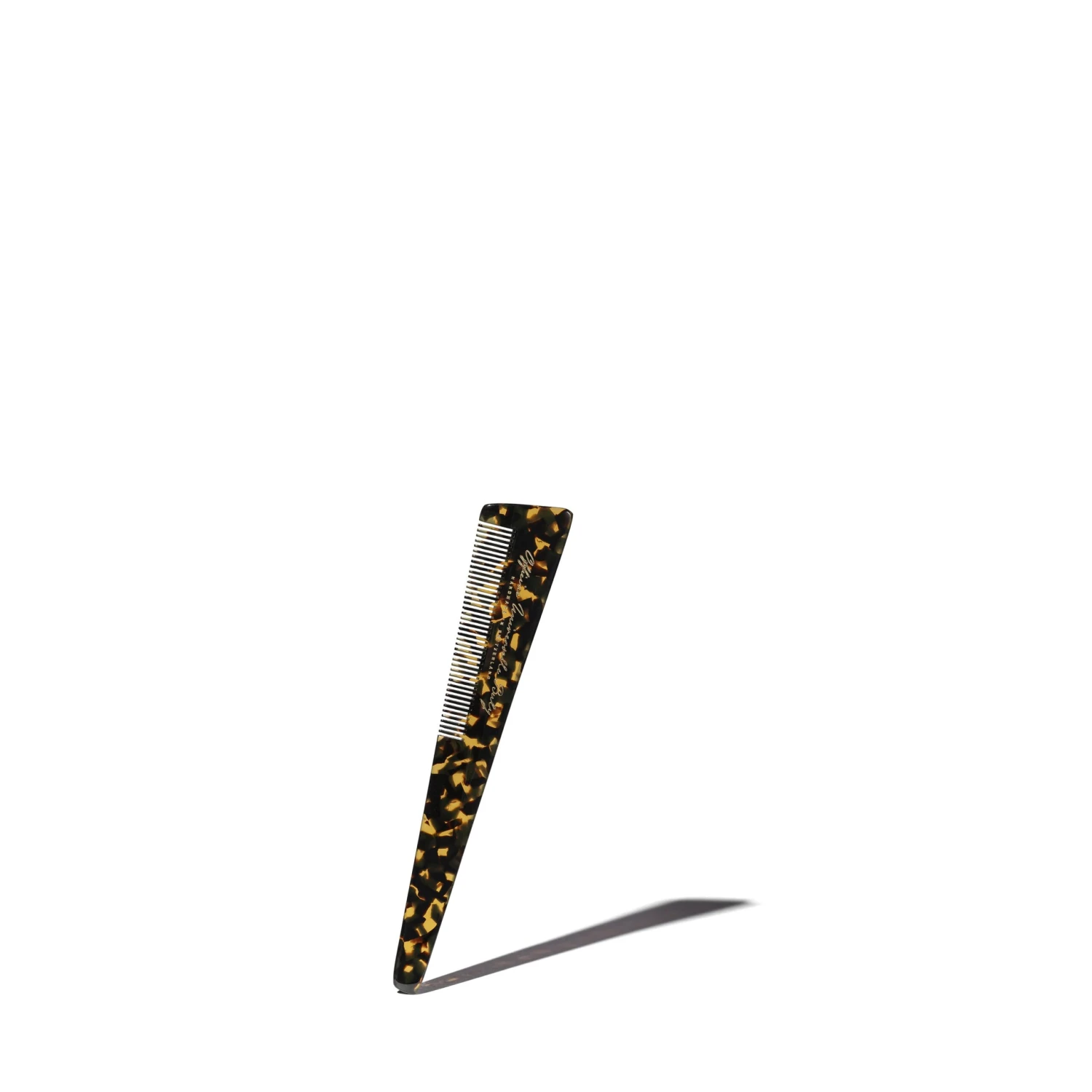 Ce peigne est fabriqué à la main en Suisse par l’un des derniers fabricants d’Europe. Taillé dans un bloc d’acétate de très haute qualité, il est façonné, sculpté puis poli. Les dents et les entailles sont spécialement agencées pour ne pas blesser les cheveux. L’acétate, fibre végétale, révèle un motif unique, propre à chaque peigne.