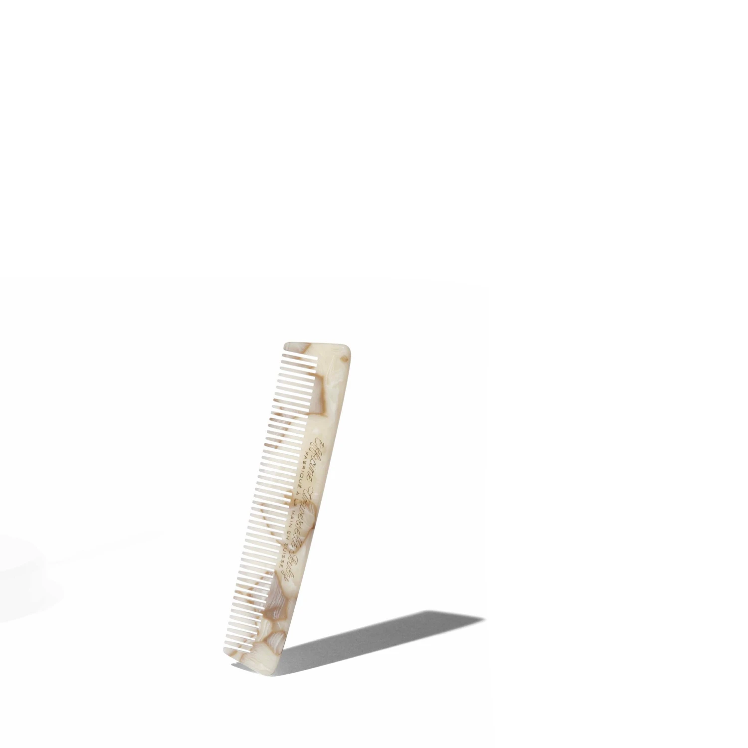 Ce peigne est fabriqué à la main en Suisse par l’un des derniers fabricants d’Europe. Taillé dans un bloc d’acétate de très haute qualité, il est façonné, sculpté et poli. Les dents et les entailles sont spécialement agencées pour ne pas blesser les cheveux. L’acétate, fibre végétale, révèle un motif unique, propre à chaque peigne.