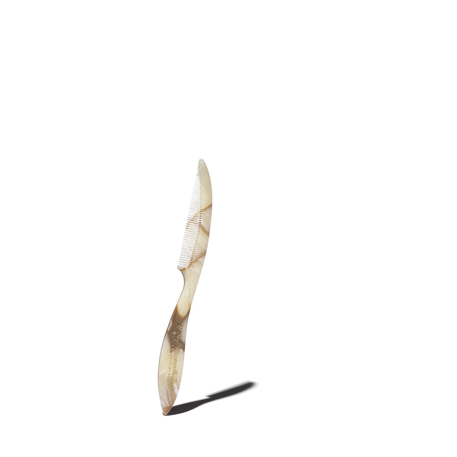 Ce peigne est fabriqué à la main en Suisse par l’un des derniers fabricants d’Europe. Taillé dans un bloc d’acétate de très haute qualité, il est façonné, sculpté et poli. Les dents et les entailles sont spécialement agencées pour ne pas blesser les cheveux. L’acétate, fibre végétale, révèle un motif unique, propre à chaque peigne.