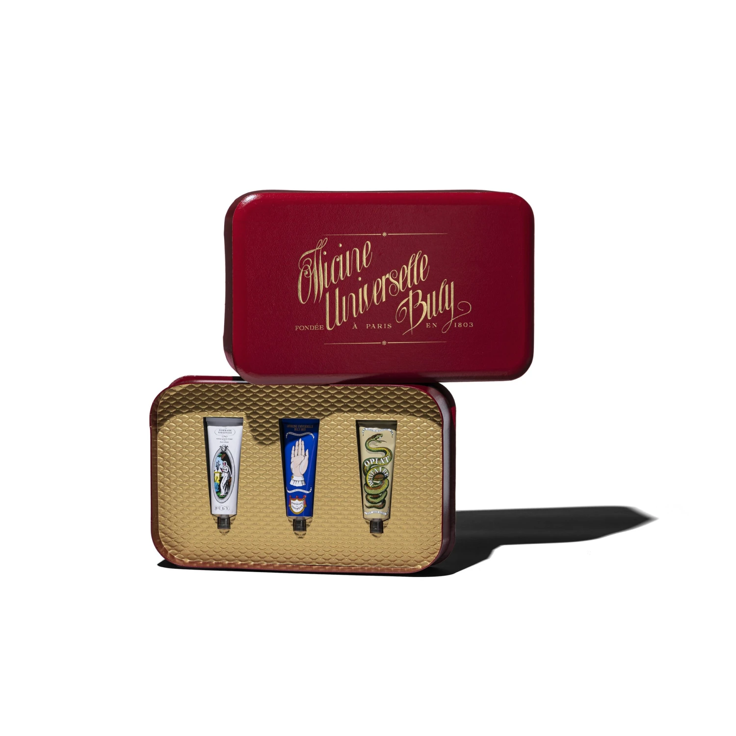 Ils sont larges, cuirés et sertis de calligraphies à la couleur dorée… Les nouveaux coffrets de l’Officine Universelle Buly sont un prélude à la beauté retrouvée. Aux coloris raffinés – Vert Impérial, Rouge Cardinal et Ébène – ils permettent la création de quatre types d’assemblage de soins, de parfums et d’accessoires pour que chaque jour soit embelli par l’oeuvre de l’Officine Universelle Buly.