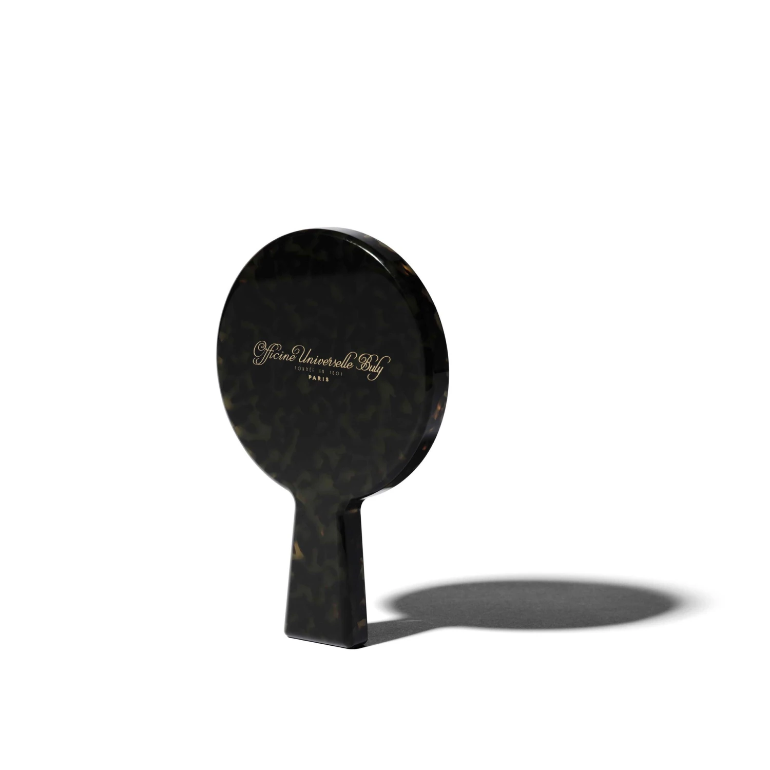 Le miroir de poche en acétate de l’Officine se voit offrir la plus grande des distinctions : la personnalisation. Les initiales (trois au maximum) se gravent et se dorent sur le manche du miroir, pour revendiquer propriété.
